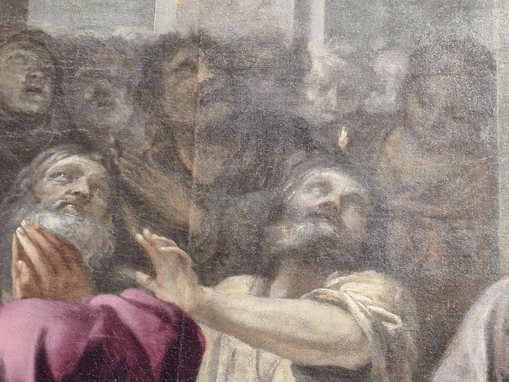 Thema dieses Mays ist die Begegnung des Apostels Petrus mit dem römischen Centurio Kornelius. Dem erschien, wie die Apostelgeschichte berichtet, ein Engel Gottes, der ihm den Auftrag gab, Petrus in Caesarea treffen: „Als nun Petrus ankam, ging ihm Kornelius entgegen und warf sich ehrfürchtig vor ihm nieder/ Petrus aber richtete ihn auf und sagte: Steh auf! Auch ich bin nur ein Mensch.“[5]Und Kornelius lässt sich als einer der ersten nach dem Tod Jesu von Petrus taufen. Auch hier ist der Unterschied zwischen der alten Gesamtdarstellung und dem Ausschnitt aus dem restaurierten Gemälde sehr deutlich und eindrucksvoll.