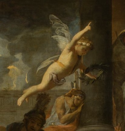 [1a] Abgebildet ist hier ein vorbereitendes kleineres Gemälde von Bon Boullogne. Dabei handelt es sich um ein übliches Verfahren: Vorab wurden Skizzen und auch solche kleineren Gemälde angefertigt, bevor dann der endgültige Auftrag für ein großformatiges May-Gemälde erteilt wurde. Der abgebildete Entwurf wurde 2020 bei Sotheby’s vom Museum in Bayonne ersteigert. http://www.lecurieuxdesarts.fr/2020/12/une-peinture-de-bon-boullogne-pour-le-musee-bonnat-helleu-de-bayonne.html