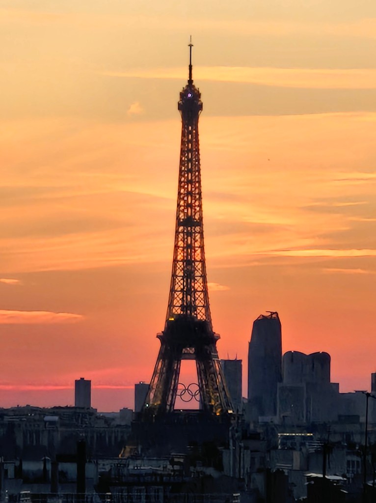 Der Eiffelturm mit den ölympischen Ringen im Abendlicht: Bald wird das Feuerwerk beginnen.