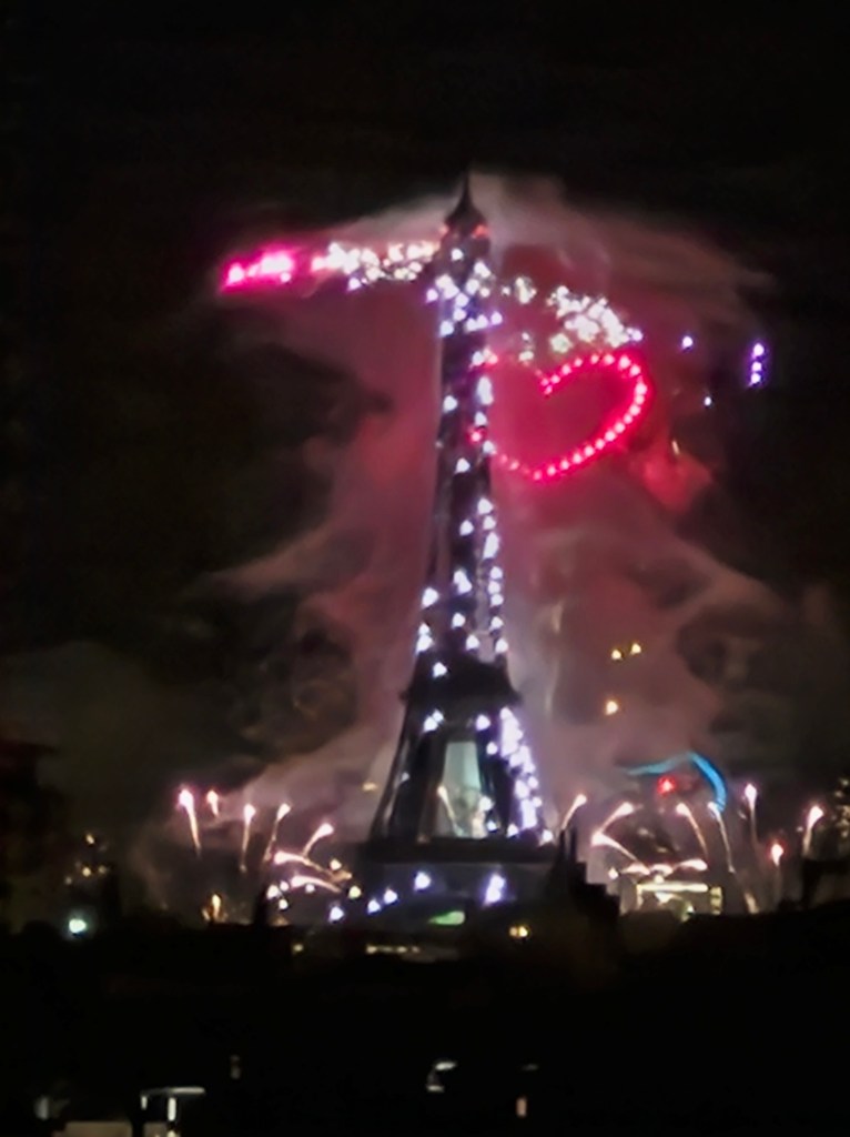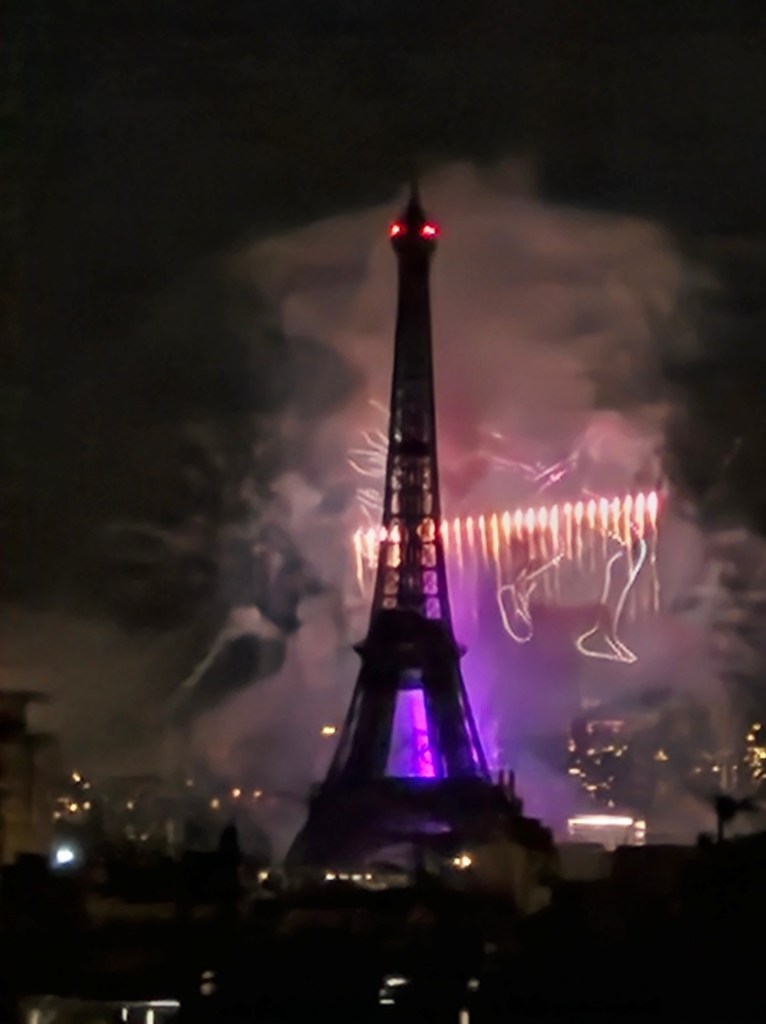 Von unserem Platz in Montparnasse aus ist die Schrift allerdings nur leicht verdeckt und seitenverkehrt zu sehen: Das Feuerwerk ist traditionell nach Nord-West zum Trocadero ausgerichtet.