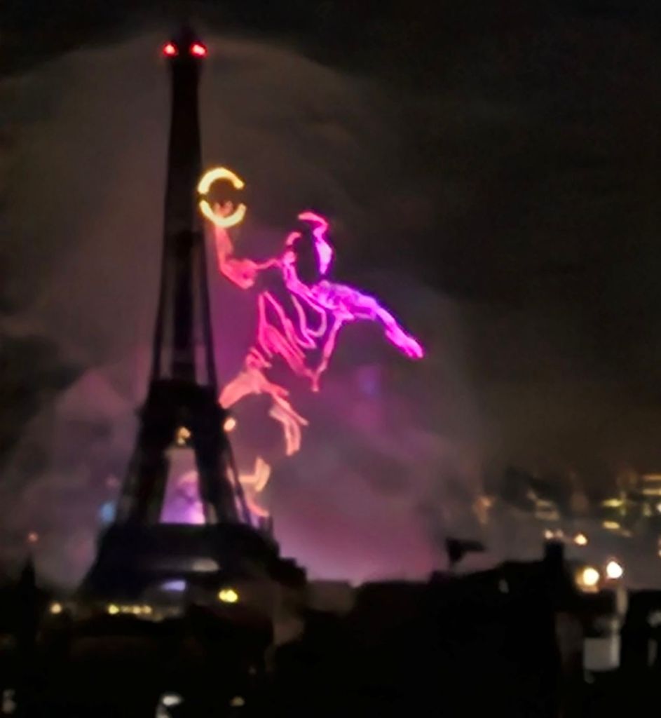 Das Feuerwerk steht diesmal ganz im Zeichen der Olympischen Spiele. Hier wird eine Läuferin mit der olympischen Fackel in den Himmel gezeichnet: Die ist seit dem 8. Mai auf einer tour de France und kam rechtzeitig zum Nationalfeiertag in Paris an. Am 15. Juli wird die doppelte Judo-Olympiasiegerin Clarisse Agbégnénou die Fackel bis auf die Spitze des Eiffelturms tragen.