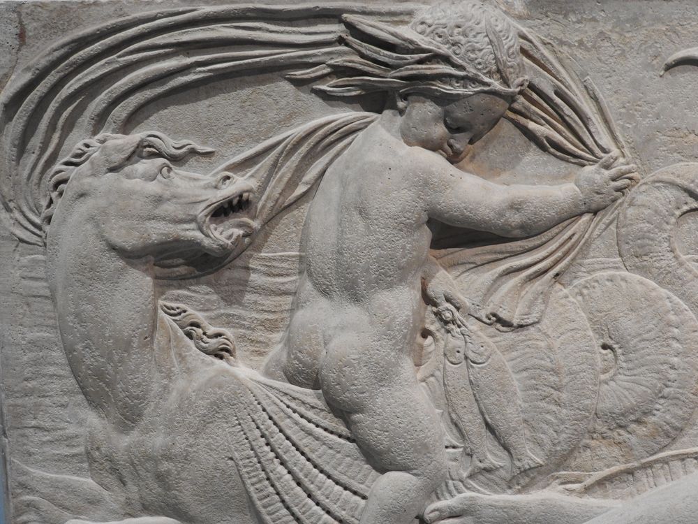 Die drei unteren horizontalen Reliefs, heute in der Ausstellung und dann im Louvre zu bewundern, verherrlichen die Ozeane: Das verdeutlichen die wilden Geschöpfe, auf denen kleine Genien reiten: