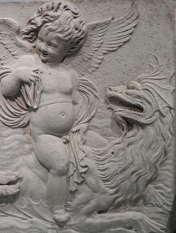 Ein kleiner Genius mit Fischen auf einem Hippokamp