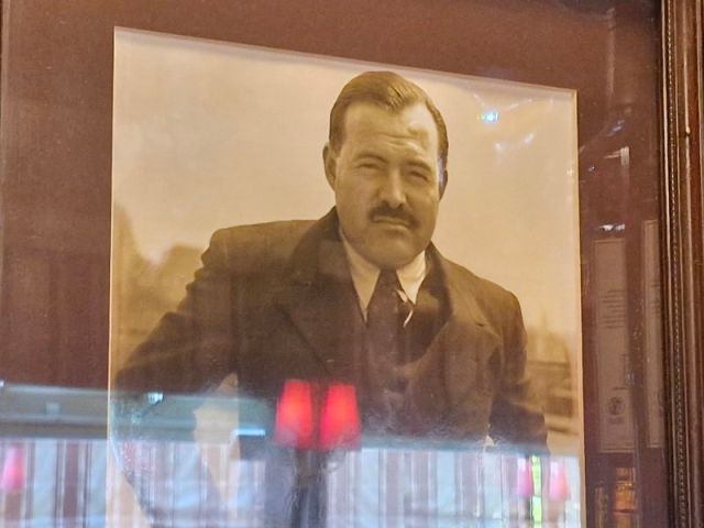 Neben der Bar hängt ein Foto Hemingways…