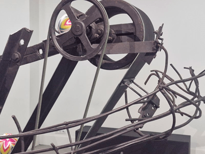 Dies ist die eine Ball-Transport- und Wurfmaschine: Rotozaza I aus dem Jahr 1967. Es ist, nach der beigefügten Informationstafel, „eine verschlingende Maschine, die den Produktionsprozess pervertiert, da sie mit Ballons gefüttert wird, die sie wieder ausspuckt. Sie ist spielerischer Ausdruck der Kritik Tinguelys am kapitalistischen System und seines anarchistischen und rebellischen Geistes. Damit richtet sie sich besonders an Kinder, die für Tinguely seine beliebtesten Adressaten (public préféré) waren.“ Leider war diese Maschine nicht in Betrieb: Kinder hätten sicherlich eine große Freude daran gehabt, die Maschine mit den ausgeworfenen Bällen zu füttern…