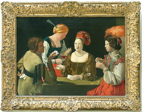 Gorges de La Tour ist auch für seine hellen Bilder bekannt. Es sind Szenen der Täuschung, in denen die Schönheit der Körper, die unschuldigen Gesichter und die kostbaren Gewänder nur dazu dienen zu täuschen. Keine krampfhaften Bewegungen wie bei Caravaggio, sondern eingefrorene Gesten und spähende Blicke… doch Hände bereiten sich darauf vor, eine Geldbörse zu stehlen, eine Goldkette durchzuschneiden, Gewinnkarten zu verstecken. Auch unsere Blicke werden zu Voyeuren, zu Komplizen von Dieben und Betrügern. Aber diese Bilder sind in der Ausstellung nicht zu sehen. So auch nicht das nachfolgend abgebildete: Le Tricheur à l’as de carreau (Der Betrüger mit dem Karo-Ass) aus dem Louvre.