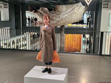 Ron Mueck, Woman with Shopping (2013). Dahinter der obere Teile des Miracéus.