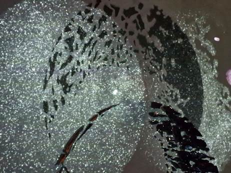 Jivya Soma Mashe, Fischnetz (2009). Der Künstler aus dem Stamm der Warlis in Maharashtra/Indien hat eine 4500 alte künstlerische Maltradition neu belebt. Seine Szenen des Ackerbaus, der Ernte, der Tierwelt oder -wie hier- des Fischfangs sind mit Kuhdung und Acrylfarben gemalt.