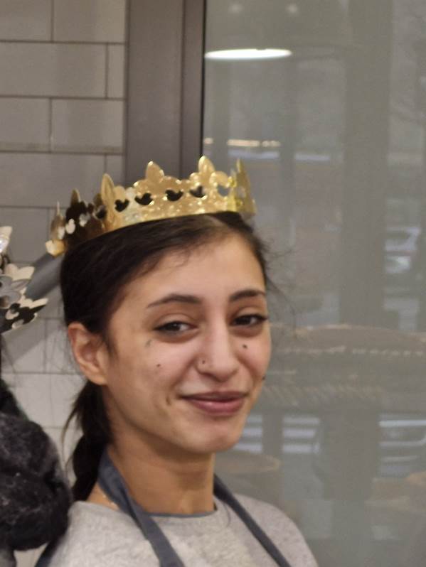 Eine Verkäuferin der Boulangerie Landemaine im 11. Arrondissement von Paris mit der Krone, die zu jeder Galette gehört.