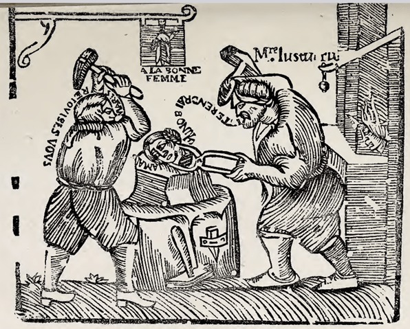 Maitre Lustucru“ – hier als Schmied dargestellt,  schlägt in Begleitung eines Arbeiters auf den Kopf einer Frau, den er mit einer Zange in seinen Armen auf einem Amboss hält, und ruft aus: Je te rendrai bon (Ich werde es dir gut machen), worauf der Mitarbeiter hinzufügt: Maris, réjouissez-vous (Ehemänner, freut euch). Man beachte, dass ein weiterer Kopf einer üblen Frau auf dem Herd der Schmiede liegt und darauf wartet, dass der Schmied ihn der gleichen Operation unterzieht, um ihn ebenfalls gut zu machen. Oben links sehen wir ein Schild mit einer kopflosen Frau und darunter die Inschrift „A la bonne femme“ (Auf die gute Frau).