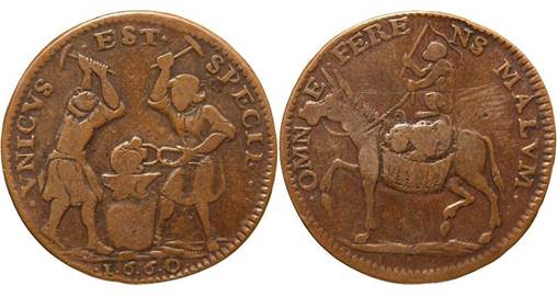 Auf der einen Seite der Münze arbeiten unter dem Slogan „unicus est specie“, er ist der Einzige seiner Art, zwei Schmiede an einem Frauenkopf. Auf der anderen Seite ist ein mit Frauenköpfen beladener Esel abgebildet. Auf der Umschrift steht:  „omne ferens malum“, er trägt alles Böse hinweg, und zeigt an, dass Frauenköpfe in großen Mengen transportiert werden müssen, damit Lustucru sie bearbeiten kann.