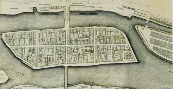 Île Saint-Louis und Île Louviers  – Auschnitt aus dem Turgot-Plan 1739  mit dem Pont Marie (links) und dem Pont de la Tournelle (rechts)