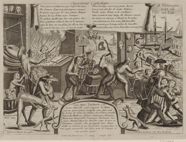 Eine frühere Quelle ist Jacques Lagniets Sammlung der berühmtesten Sprichwörter (Recueil des plus illustres proverbes, divisés en trois livres), die zwischen 1657 und 1663 in Paris gedruckt wurde. Sie ist illustriert mit 119 satirischen Drucken , die das Leben, die Sitten und die Sprichwörter des französischen Volkes unter den Regentschaften von Ludwig XIII. und Ludwig XIV. zum Inhalt haben. Dazu gehören auch Bilder zu dem Motto „femme sens teste tout en est bon) und von Lustucru., erst als Scharfrichter, dann als Schmied und „Kopfchirurg“.