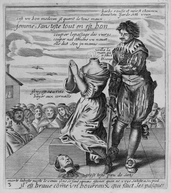 Der Kupferstich zeigt eine enthauptete Frau, aus deren Hals Blut spritzt, die aber noch immer mit gefalteten Händen kniet ; neben ihr der Henker mit dem Schwert in der Hand, ihr Kopf auf dem Boden, umgeben von einer schaulustigen Menge. Dazu sind eine Reihe  „Sprichwörter“ eingraviert:  il n’y a pas à rire (da gibt es nichts zu lachen), il est brave comme un bourreau qui fait ses Pâques (er ist so mutig wie ein Henker, der Ostern feiert), c’est un bon médecin, il guérit de tous maux  (er ist ein guter Arzt, er heilt alle Krankheiten), couper le passage des vivres (schneidet der Nahrung den Durchgang ab), couper net comme navet (sauber geschnitten wie eine Rübe),  grosse tête peu de sens (großer Kopf, wenig Sinn)  neben dem abgetrennten Kopf!),  morte la bête morte le venin, il ne se faut jamais étonner qu’on ne voie sa tête à ses pieds (tot das Biest, tot das Gift, man sollte sich nie wundern, dass man seinen Kopf zu seinen Füßen sieht).