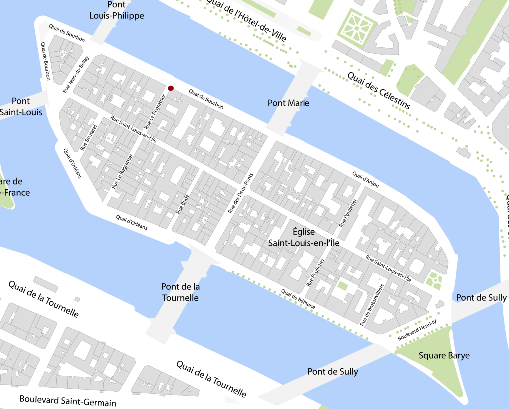 Île Saint-Louis heute. Der rote Punkt markiert die „geköpfte“ Statue