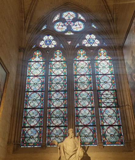 Bei der Rekonstruktion wurde also auf jedwede zeitgenössische Veränderung und Neuerung des Baus verzichtet. Symbol der getreuen „résurrection“ der Kathedrale ist der mächtige Dachreiter, der 2019 bei dem Brand einknickte und das Dach der Kirche durchschlug. Auch dieser Dachreiter aus dem 19. Jahrhundert mit dem Abbild Viollet-le-Ducs wurde exakt wiederhergestellt. Und dies gilt auch für die Fenster, einschließlich der 12 von Viollet-le-Duc entworfenen.