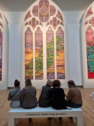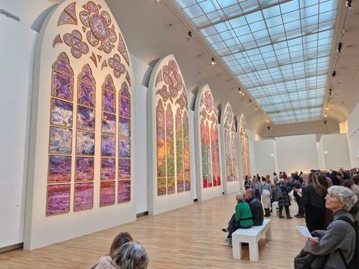 Trinks allerdings nennt den „dräuenden Gewitterhimmel“ in einem Atemzug mit dem „Apostel-Ringelreihen“ davor. Immerhin gesteht er am Ende dann doch zu, dass jeder ja sich selbst „vor Ort seine Meinung bilden“ könne. In diesem Punkt kann ich ihm zustimmen. Und dazu ist noch bis zum 15. März im Grand Palais Gelegenheit und ab Ende des Jahres dann auch in Notre-Dame selbst. Dann wird man vielleicht auch sehen, ob die Fenster Tabourets wirklich brachial das „fein austarierte Lichtspiel“ der Kirche zer-stören oder sich nicht vielmehr „harmonisch in die gotische Ästhetik der Kirche“ einfügen, sie durch ihr neues Licht bereichern und zu einem Dialog zwischen Tradition und Innovation anregen.[15]