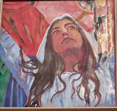 „Maria erscheint körperlich und ekstatisch, das Haar offen, das Gewand blau. Ein zeitgenössischer Blick auf eine uralte Geschichte.“[10] Maria, so Tabouret, sei üblicherweise schamhaft und in sich gekehrt dargestellt. Bei ihr dagegen steht sie aufrecht, den Betrachtern zugewandt, in einer sehr expressiven Haltung, die Arme zum Himmel gestreckt, die Augen gerötet durch den Tod ihres Sohns, die Haare kämpferisch gelöst (les cheveux en bataille).[11]
