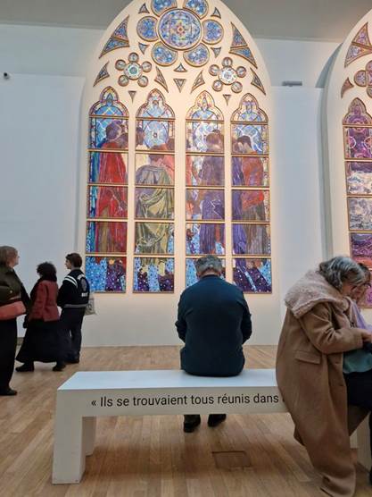 Das erste für die Kapelle Saint-Joseph bestimmte Fenster zeigt die versammelten Apostel. Auf der Bank davor ein Satz aus der biblischen Apostelgeschichte: Als der Tag des Pfingstfestes gekommen war, waren alle zusammen am selben Ort.