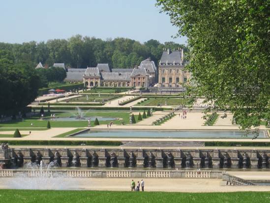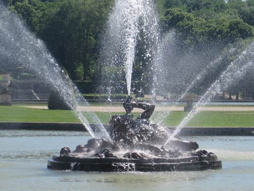Eine prägende Bedeutung hatten die Wasserspiele des Gartens. Insgesamt gab es 36, von denen allerdings nur noch 20 heute existieren: Der Reichtum an Springbrunnen war für die Zeitgenossen ein wesentliches Kriterium für die Wertschätzung eines barocken Gartens. Und Wasser war in Vaux reichlich vorhanden. Es gab beim Bauplatz Bäche und das Flüsschen Anqueil, die genügend Wasser lieferten, um die vielen Springbrunnen zu betreiben. Hier waren also nur recht begrenzte Wasserbaumaßnahmen erforderlich, im Gegensatz zu dem dafür topografisch ungeeigneten Versailles, wo selbst pharaonische Bauwerke nicht ausreichten, um Ludwigs XIV. größenwahnsinnige Vorstellungen ewig sprudelnder Fontänen zu erfüllen.