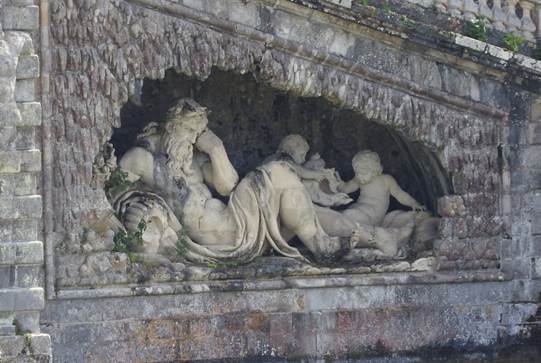 In die beiden Grottenhöhlen (Plan Nr. 18) sind die Skulpturen zweier Flussgötter eingefügt. Hier in der linken Grottenhöhle der einheimische Flussgott Anqueuil ….