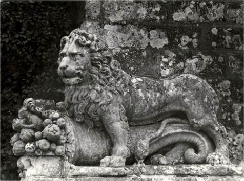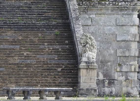 Die Treppenaufgänge rechts und links der Grotte werden von zwei Löwen flankiert, jeweils in Begleitung eines Eichhörnchens, dem Wappentier Fouquets.[14]