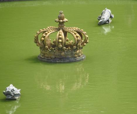 In der Mitte dieses Gartenteils liegt der „Kronenbrunnen“. Hier schwebt eine goldene Krone scheinbar auf der Wasserfläche eines Teiches und spiegelt sich in der Sonne.