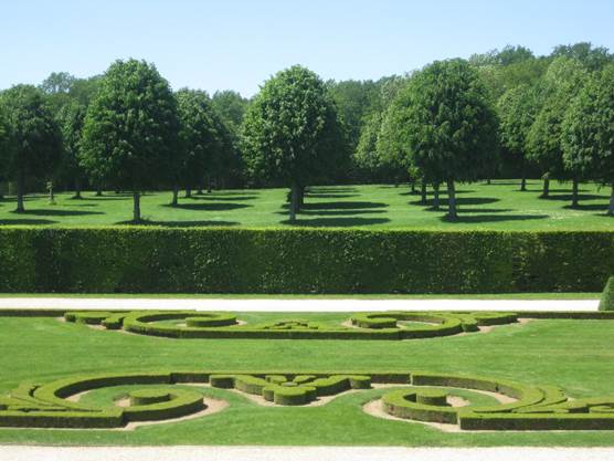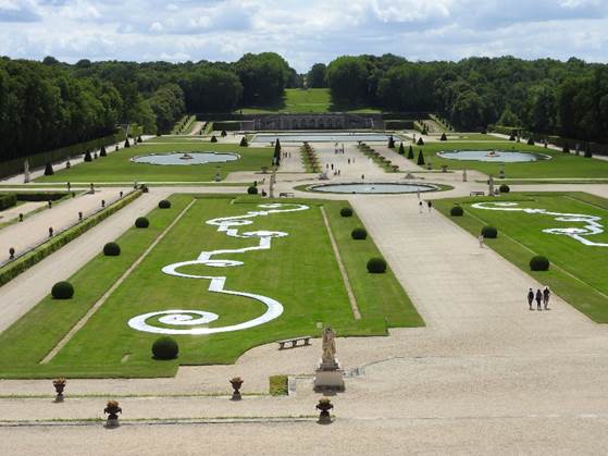 Von der Schlossterrasse aus überblickt man den durch eine Hauptachse gegliederten Garten. In der Mitte das sogenannte Broderieparterre, zwei symmetrisch angelegte teppichartige Beete mit einem kunstvollen Muster beschnittener Buchsbaumhecken. Zur Entstehungszeit des Schlosses von Vaux-le-Vicomte galten sie als der vornehmste Schmuck eines Gartens.[6]