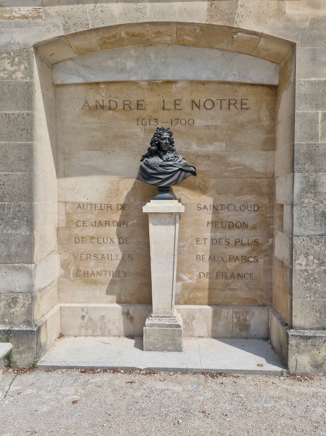 Kurz hinter dem Eingang zum Tuilerien-Garten, den ebenfalls Le Nôtre geplant hat, ist auf der linken Seite seine Büste in die Mauer eingelassen. Da werden die Gärten von Versailles, Chantilly, Saint-Cloud und Meudon als seine herausragenden Kreationen genannt. Vaux-le-Vicomte fehlt, auch wenn es der erste und wegweisende Barockgarten Le Nôtres und Europas war.