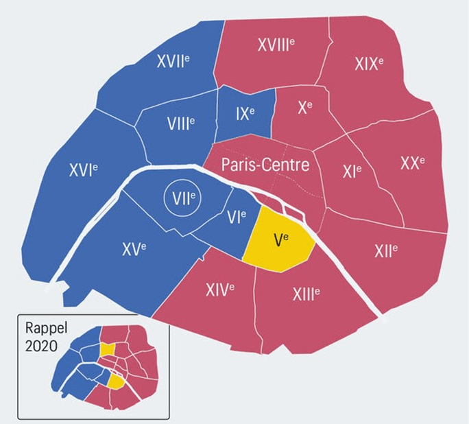 Dieses Schaubild aus dem Parisien vom 16. März zeigt, welche Parteien im ersten Wahlgang der Pariser Kommunalwahlen am 15. März 2026 in den einzelnen Pariser Arrondissements in Führung lagen. In den blauen Arrondissements war das eine Mitte-rechts-Koalition (LR,MoDem, UDI), deren Spitzenkandidatin für das Amt der Bürgermeisterin von Paris Rachida Dati von der konservativen Partei Les Républicains (LR) ist. Dati ist Bürgermeisterin im 7. Arrondissement und wurde dort schon im ersten Wahlgang direkt wiedergewählt. Zuvor war sie Kultusministerin und auch schon Justizministerin, muss sich allerdings im September 2026 in einem Prozess u.a. wegen Vorwürfen der Korruption verantworten. In den roten Arrondissements hatte ein linkes Parteienbündnis (PS, Grüne, PCF) im ersten Wahlgang die Mehrheit. Spitzenkandidat ist hier der Sozialist Emmanuel Grégoire. Er war von 2014 bis 2024 in der Pariser Stadtverwaltung tätig, zuletzt als premier adjoint, also „zweiter Mann“ nach der Bürgermeisterin Anne Hidalgo, die nicht mehr kandidiert. In dem gelben 5. Arrondissement lag im ersten Wahlgang Pierre-Yves Bournazel vor, der eine von Macron unterstützte liberale Liste (Renaissance-Horizonts) anführt.