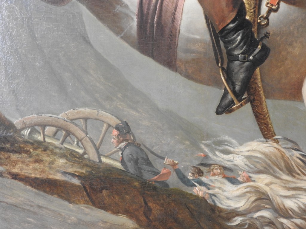 Hinter dem bewaffneten und mit Lorbeerkranz als Held gefeierten Napoleon mit aufgeplustertem Gewand sitzt schmächtig und in sich gekehrt der Papst, als habe er mit dem Geschehen vor ihm nichts zu tun: Zwischen ihm und Napoleon gibt es keine Verbindung von Blicken und Gesten.