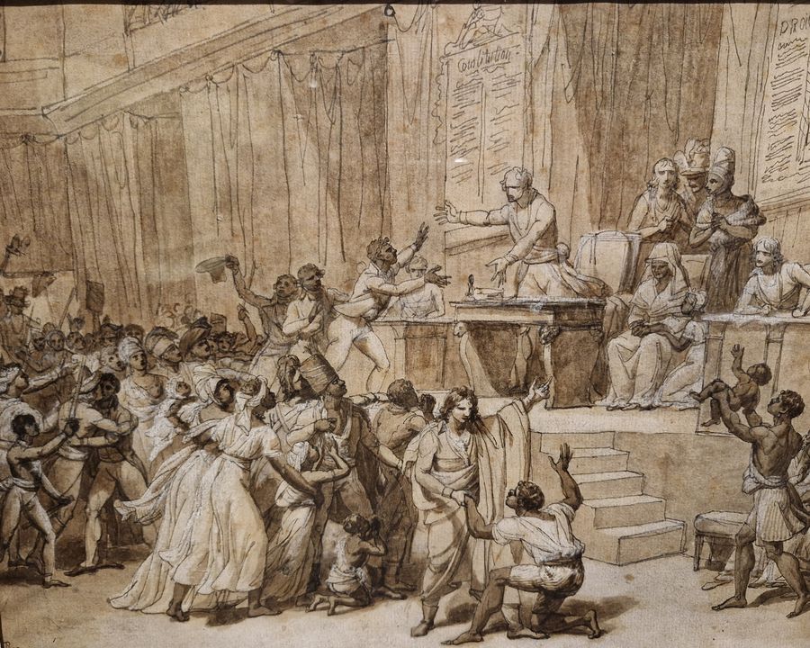 Napoleons „Hofmaler“ Jacques Louis David hat diese Szene in einer Zeichnung festgehalten, die derzeit in einer David-Ausstellung im Louvre [4] zu sehen ist: