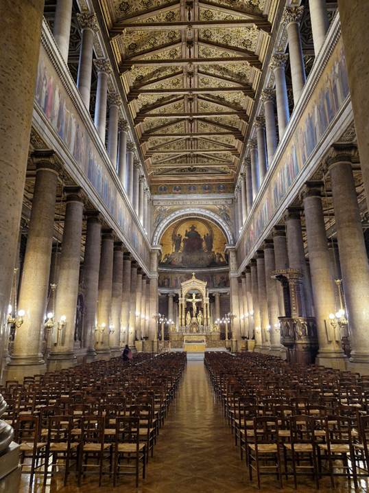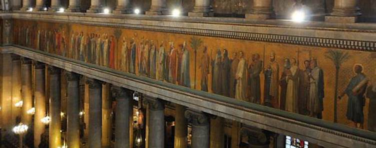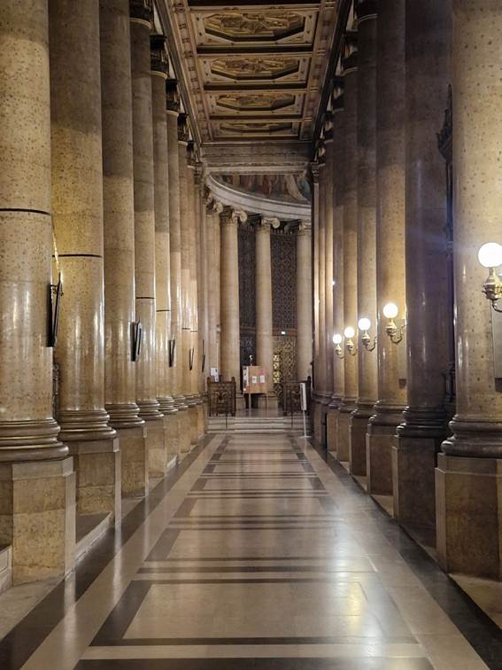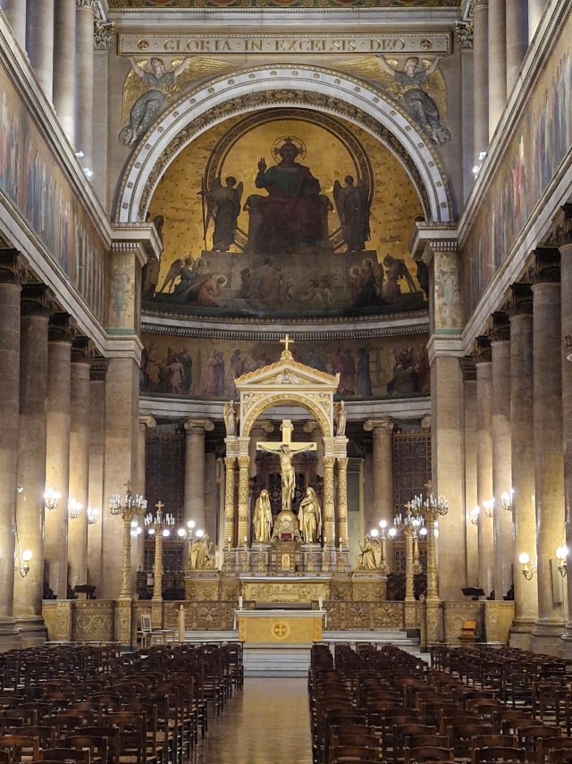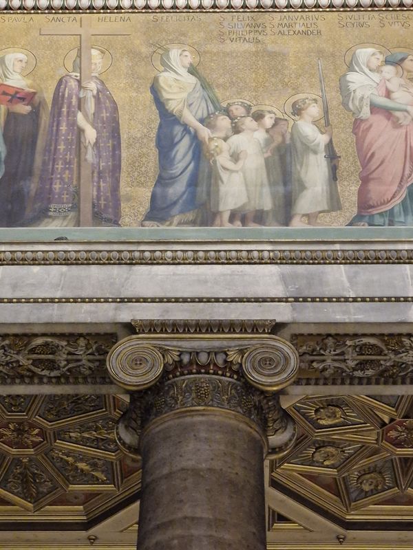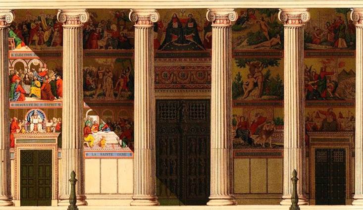 Lepères Bauentwurf sah für alle Säulenreihen im Kircheninneren eine korinthische Ordnung vor. Hittorff wird sie nur für die Emporen belassen, die große Kolonnade im Grundgeschoss aber in eine für frühchristliche Basiliken übliche Ionica konvertieren, weil er nur so die „Eroberung der Kunst der Hellenen durch die moderne Kunst und des Heidentums durch die christliche Religion“[8] verwirklicht sieht. „Im Verständnis des archäologischen Klassizismus war die ionische Ordnung jene Griechenlands, die korinthische jene Roms.“[9] Hittorff warf den Zunftgenossen vor, hier nicht orthodox genug vorzugehen, wenn sie „fast überall korinthische Säulen“ verwendeten, den römischen Architekten nachgebildet“. Die Ionica versah er mit einem Halsband, das mit Traubenranken und Ähren geschmückt frühchristliche Symbolik zitiert. „Es lässt sich bis in Details hinein immer wieder nachzeichnen, wie orthodox Hittorff das restaurative Programm der religiösen Erneuerung mit dem Kanon der Beaux-Arts abglich.[10]