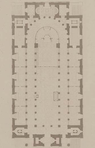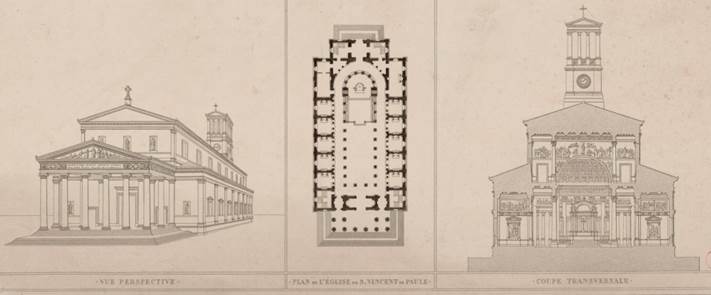 Zwar war auch Lepères Entwurf für St. Vincent-de-Paul schon der Versuch die antike Tradition bzw. die klassizistische Baukunst – emblematisch ist der Portikus – mit der frühchristlichen Basilika als Zeichen der christlichen Erneuerung zu verbinden. Perspek-tivische Ansicht, Grundriss und Querschnitt aus dem Plakat für die Grundsteinlegung der Kirche vom 25. August 1823 und Entwurfzeichnungen, die im Wallraf-Richartz-Museum in Köln aufbewahrt werden, lassen dies erkennen.
