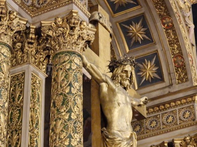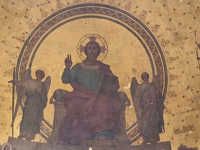 Überdies krönte Hittorff die Giebelspitze des Portikus mit einem Kreuz. Wie die Päpste in Rom den heidnischen Obelisken ein Kreuz auf die Spitze setzten und sie so für das Christentum vereinnahmten, so wird hier das antike pagane Tempelmotiv des Portikus christlich umgewidmet.