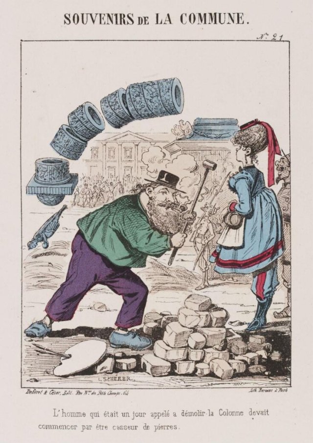 Gustav Courbet, so die Erläuterung, sei gezwungen, jeden Tag dort hinzukommen, um Bilder für die Rekonstruktion der Säule zu malen. Dies bezieht sich auf einen Vorschlag, den Courbet unvorsichtiger Weise im Vorfeld seines Prozesses vor dem Militärgericht selbst gemacht hatte – ohne dass dies allerdings zunächst irgendwelche Konsequenzen nach sich zog. [33].