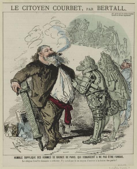 Hier wird Courbet, typischer Weise übertrieben beleibt und mit roter Commune-Schärpe um den Bauch, auf die Vendôme-Säule gestützt in Herrscherpose dargestellt. Und die „Pariser Bronze-Männer“, unverkennbar Henri Quatre und Louis Quatorze, bitten „untertänigst“ darum, nicht eingeschmolzen zu werden.[30] Im Hintergrund werden auch Engelsfiguren zum Einschmelzen gebracht – dabei hatte Courbet, überzeugter Antiklerikaler, als Kunstbeauftragter der Commune verhindert, dass aus der Kirche Saint Sulpice Gegenstände entfernt wurden- Teil seines allgemeinen Engagements für die Bewahrung der Kunst.