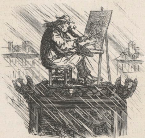 Ganz direkt wird diese Botschaft in der nachfolgend abgebildeten Karikatur von Cham aus Le Monde illustré vom 6. April 1872 zum Ausdruck gebracht. Da sitzt Courbet bei Regen und Wind vor seiner auf dem Sockel der Vendôme-Säule aufgestellten Staffelei.[32]