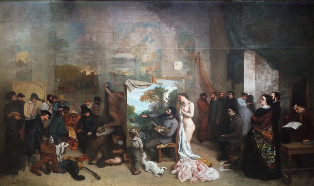 Prouhhon als „Christus“ der Commune? Das war jedenfalls die Vorstellung und Hoffnung Courbets. Proudhon und Courbet, Landsleute aus der Franche-Comté, waren seit 1847 eng befreundet und es gab einen regen intellektuellen und künstlerischen Austausch zwischen den beiden. Das wird auch im Werk Courbets deutlich. 1854/55 malte er sein monumentales Bild „L’Atelier du Peintre“, eine –wie es im Untertitel heißt- „wirkliche Allegorie, die sieben Jahre meines Künstlerlebens zusammenfasst.“ Courbet hat das Bild so beschrieben: