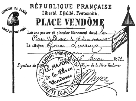 Aus Sicherheitsgründen ist der Platz abgesperrt. Für die, die ihn betreten dürfen, Vertreter der Commune, Einheiten der Nationalgarde und natürlich die mit dem Abriss betrauten Personen, Ingenieure und Handwerker, werden Passierscheine ausgestellt[3]:
