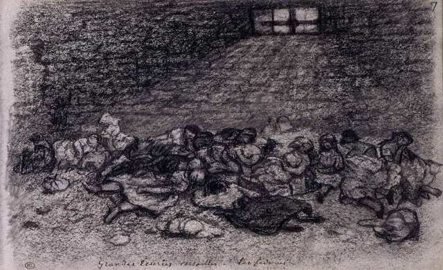 Courbet gelang es, während der semaine sanglante der blutigen Rache der siegreichen Versaillais zu entkommen. Am 7. Juni wurde er aber verhaftet, zunächst in die Conciergerie gebracht und von dort nach Versailles in die Pferdeställe, wo gefangene Kommunarden unter unsäglichen Bedingungen zusammengepfercht waren. Courbet -bis dahin nicht als Zeichner hervorgetreten- konnte immerhin einige Zeichnungen anfertigen, seltene Zeugnisse der damaligen Repression.[25]