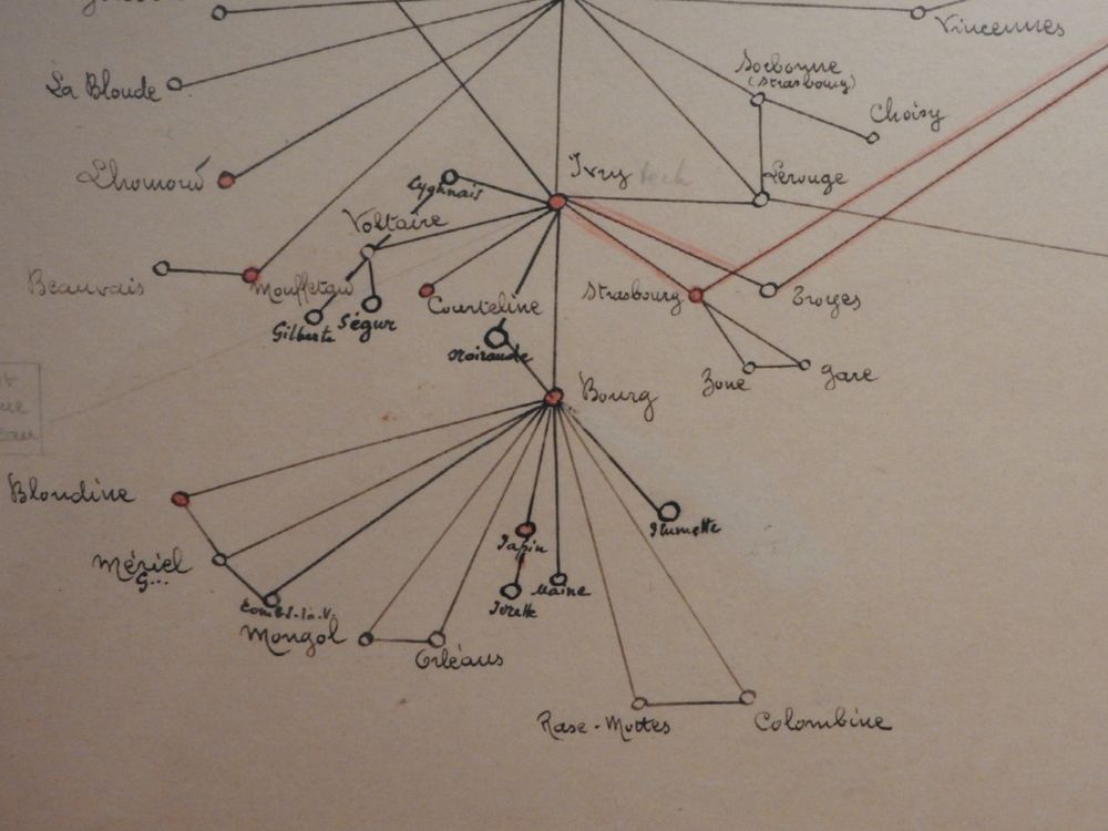 Dies ist das Organigramm der Gruppe Manouchian, hergestellt von den französischen Spezialbrigaden aufgrund der vermutlich zwischen dem 24. Juli und 11. November 1943 durchgeführten Beschattungsaktionen.[6] Die Namen beziehen sich zum Teil auf äußere Merkmale der Beobachteten, meist auf den Ort der ersten Identifizierung. Missak Manouchian, der zum ersten Mal im Bahnhof Bourg-la-Reine ins Fadenkreuz der Spezialbrigaden kam, firmiert -in der Mitte des Spinnennetzes- unter dem Namen Bourg.