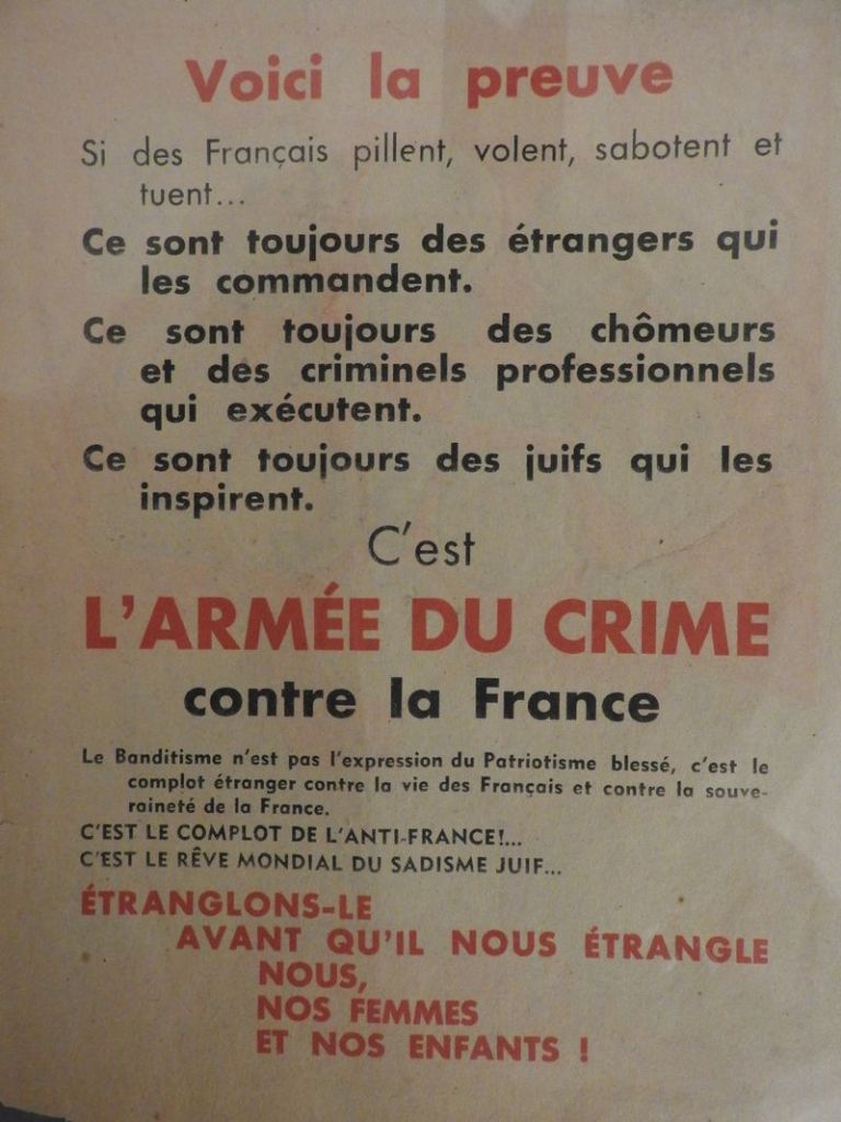 Flugblatt zu dem Plakat.[16] Die nationalistische Propaganda stellte die Manouchian-Gruppe als Feinde Frankreichs dar. Ihre Aktionen seien „ein ausländisches Komplott gegen das Leben der Franzosen“. Um dieser Propaganda nicht Vorschub zu leisten, verübten die FTP-MOI nur Anschläge auf deutsche Militärangehörige und militärische Objekte, nicht auf Franzosen.