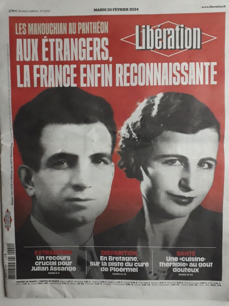 Titelseite von Libération: „La France enfin reconnaissante“ – (das endlich dankbare Frankreich) bezieht sich auf die Inschrift auf dem Portikus des Pantheon: la patrie reconnaissante. Das enfin drückt aus, dass es endlich Zeit sei für die Anerkennung des Engagements der ausländischen Widerstandskämpfer.
