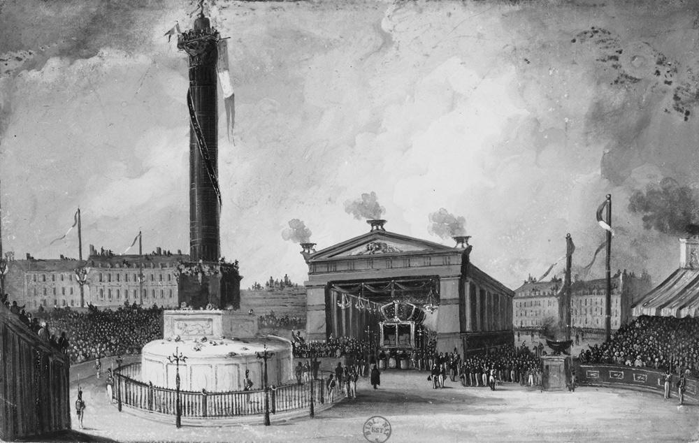 Um die Statue ist ein weißer Triumphbogen errichtet – die Farbe der Monarchie- auf der gegenüber errichteten Tribüne, am Eingang zur Place Dauphine, haben die Honoratioren Platz genommen; vor allem natürlich Ludwig XVIII. und seine Familie, darunter auch die Herzogin von Angoulême, die Tochter Ludwigs XVI. Das Kapitel der Revolution und der Republik wird damit gewissermaßen offiziell beendet.[33]